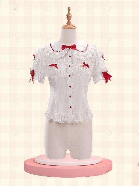 White Short-sleeved Lolita Blouse with Red Bowknots