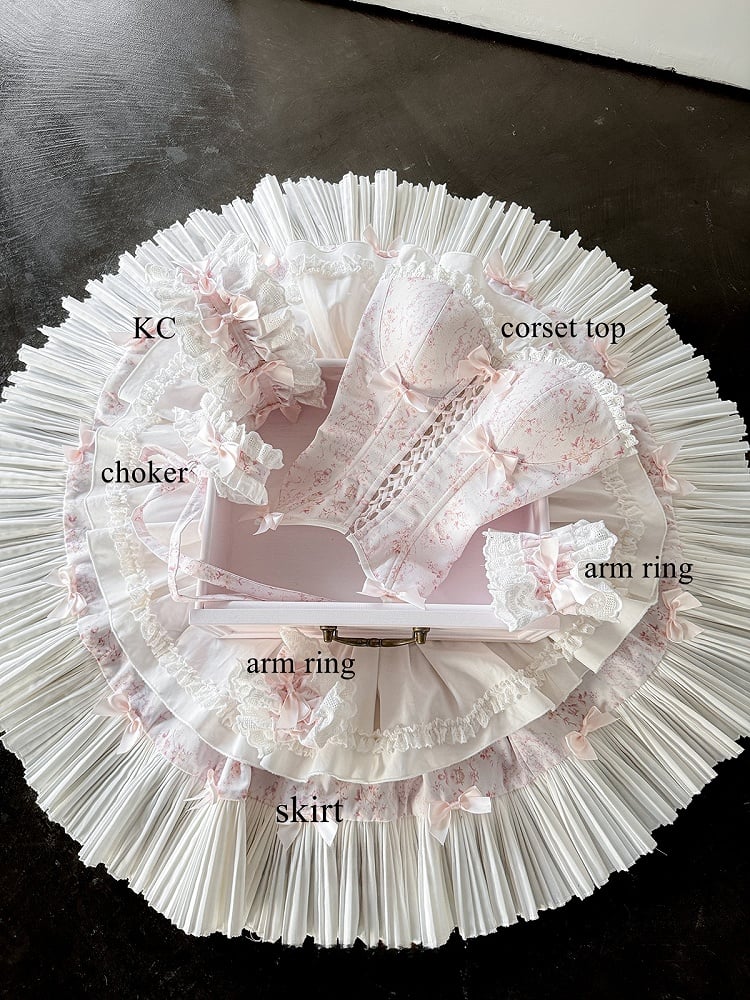 Pink & White Floral-Print Corset Top + Skirt + Choker + Arm Rings + KC Full Set