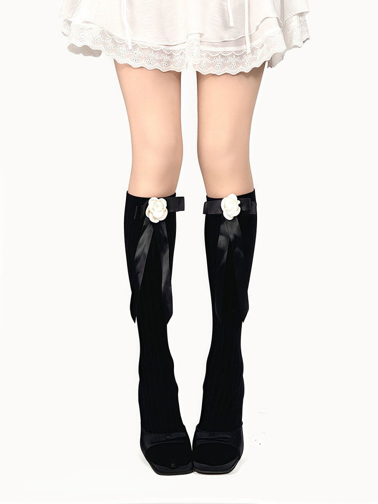 White/Black Camellia Bowknot Ribbon Calf Socks
