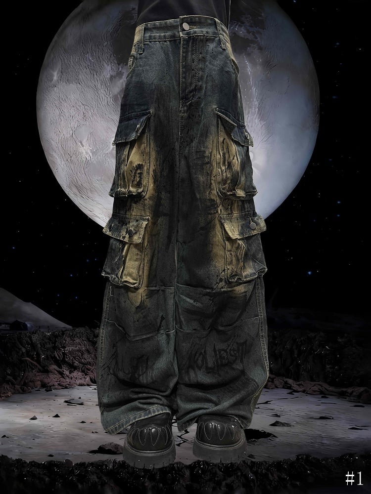 Wide-Leg Blue Faded Jeans Wash with Punk Cargo Wasteland