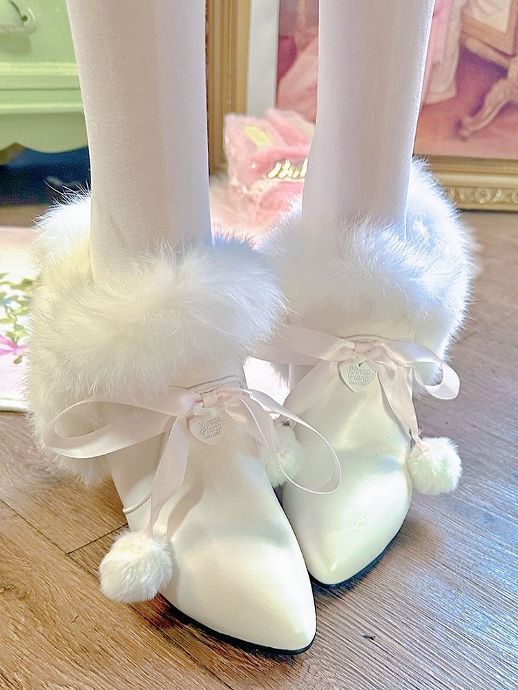 White Elegant Lolita Platform Ankle Boots with Bow Accents, Pom-pom Accents & Plush Lining