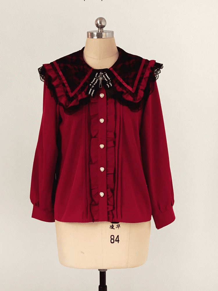 Jirai Kei Chiffon Blouse | Dark Romance Style with Pointed Lace Collar & Heart Buttons | 4 Colors
