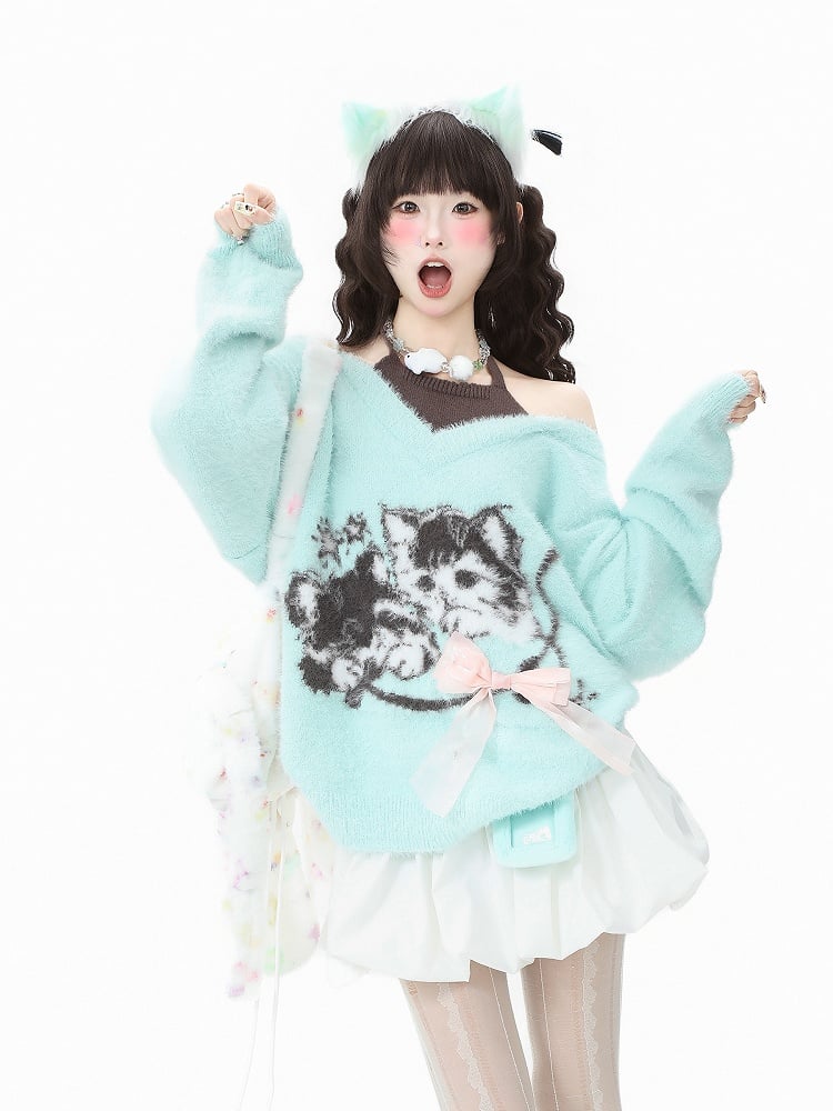 with Cat Sweater Bow Green/Black Pink Faux Two-Piece Knit Print