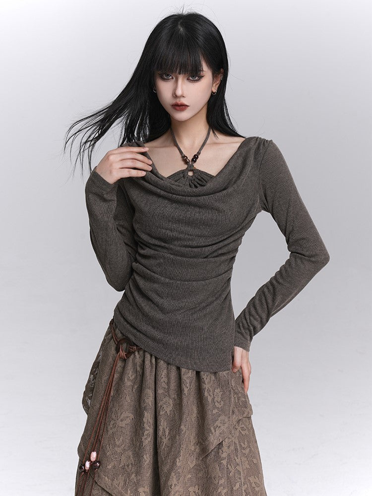 Coffee Gothic High-Stretch Halter Top with Faux Two-Piece Design