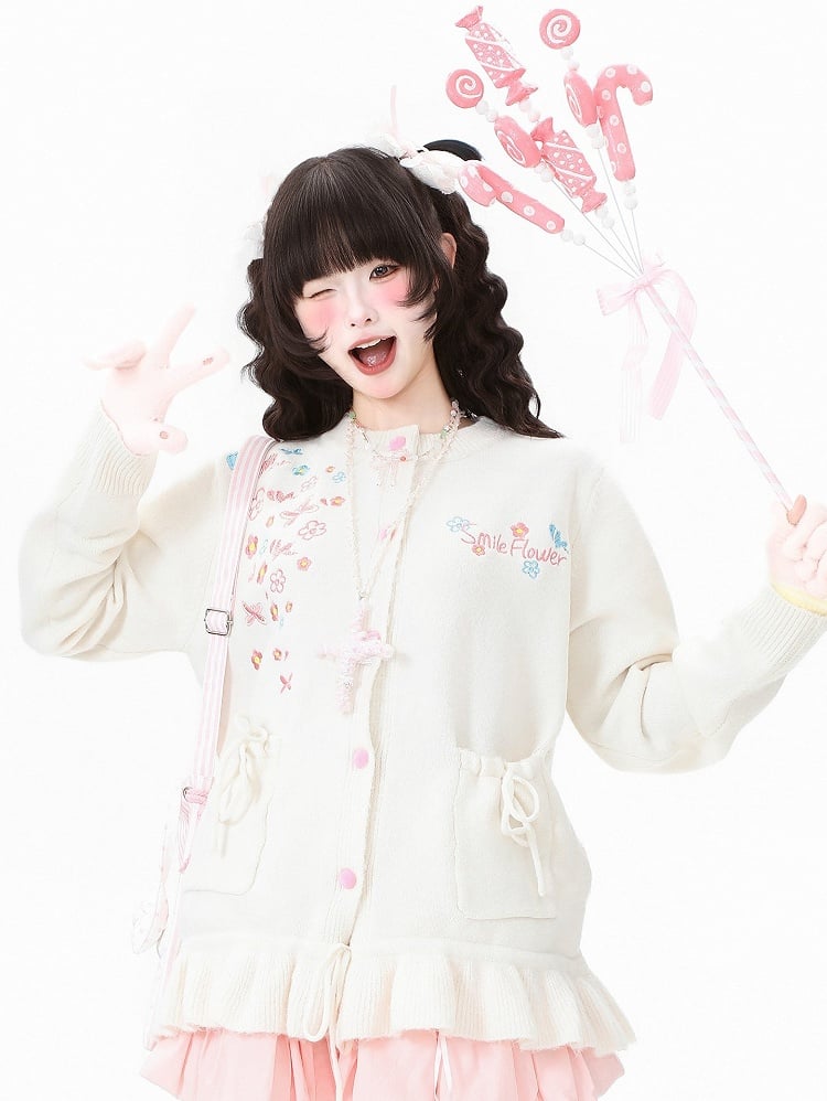 Pink/Apricot Daily Kawaii Cardigan with Ruffled Hem, Embroidered Butterflies & Flowers