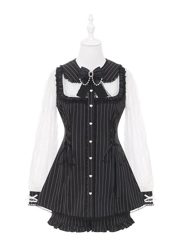 Black and White Jirai Kei Stripe Long-Sleeve Dress with Lace and Bow Bead Chain Decor + Matching Shorts Set