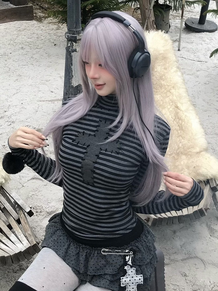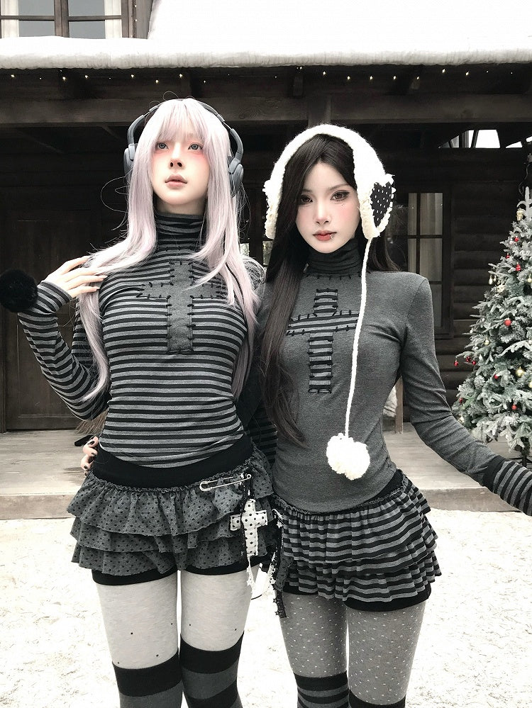 High Neck Striped Top with Detachable Pompon Accents, Cross Decor & Curved Hem