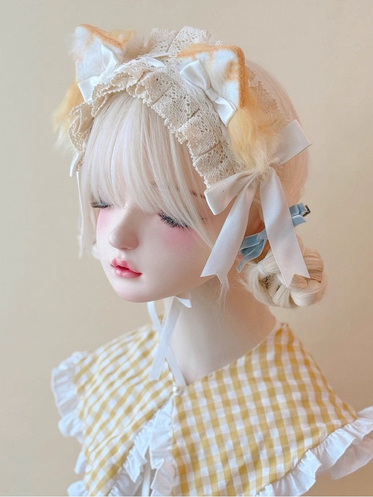 Light Orange Faux Fur Cat Ears Lace Hairband with Bow Accents