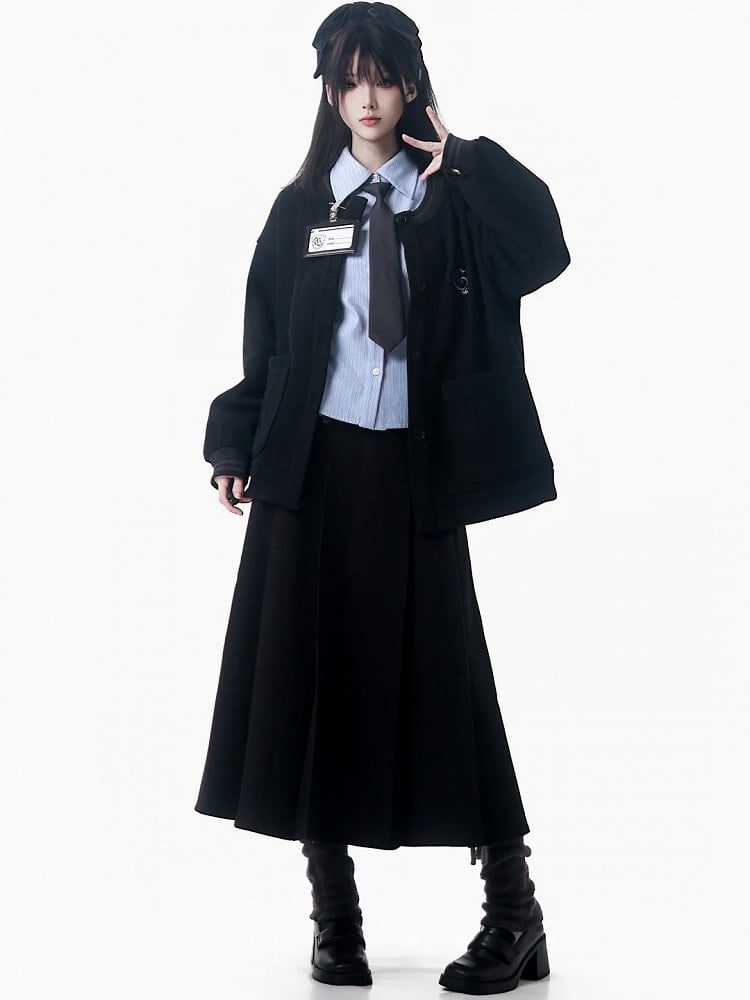 with Embroidered Lining - Black Cardigan Knit Collegiate Style Crest Fleece