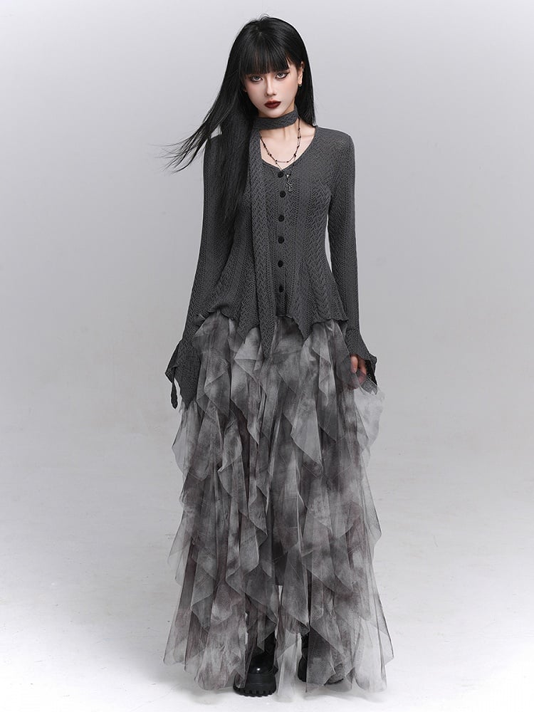 Gothic Gray Tulle Asymmetrical Skirt with Cascading Ruffles & Semi-Elastic Waist