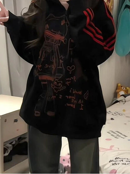 Black & Red Striped Regular/Thicken Jacket with Cartoon Graphics