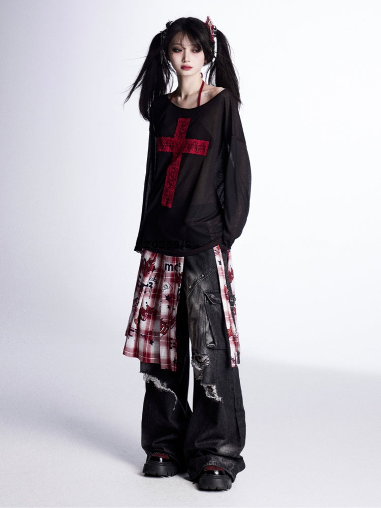 Black Sun Protection Coverup with Red Lace Cross & Asymmetrical Neckline