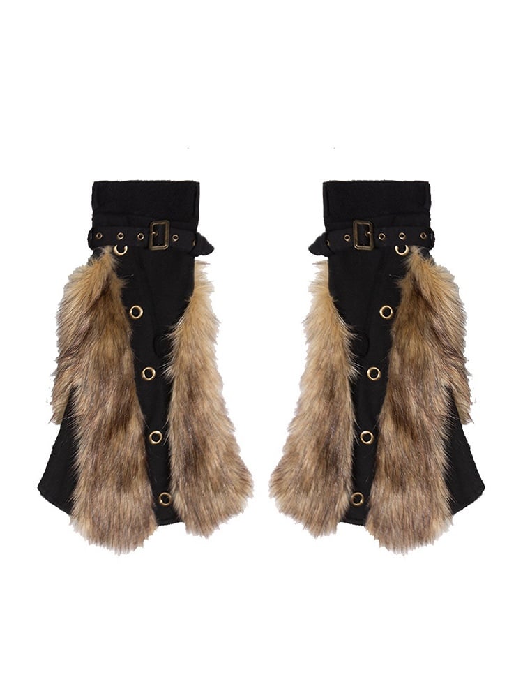 Gyaru Fashion Y2K Black Punk Leg Warmers with Buckle Straps & Faux Fur Trims