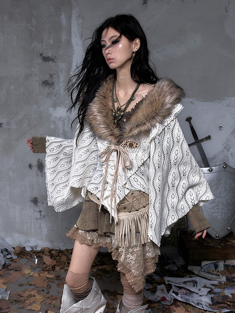Vintage Y2K Punk Beige Knit Shawl Cape with Faux Fur Collar & Handkerchief Hem