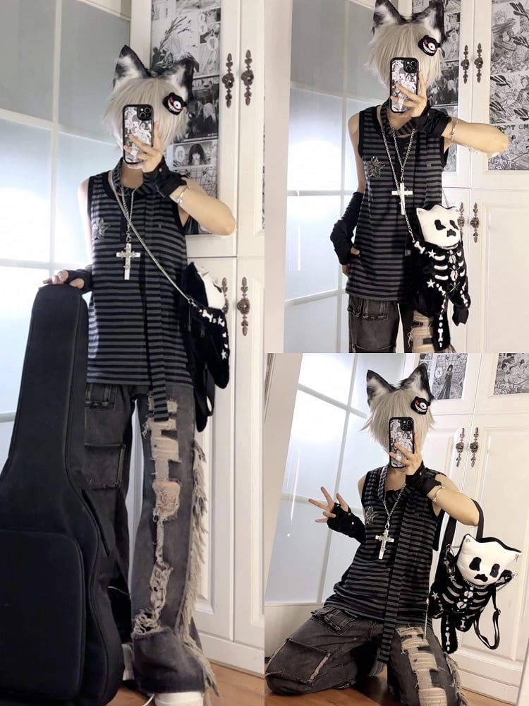 with Raw Black Jeans Distressed Faded Multi-Pockets Wash Hem