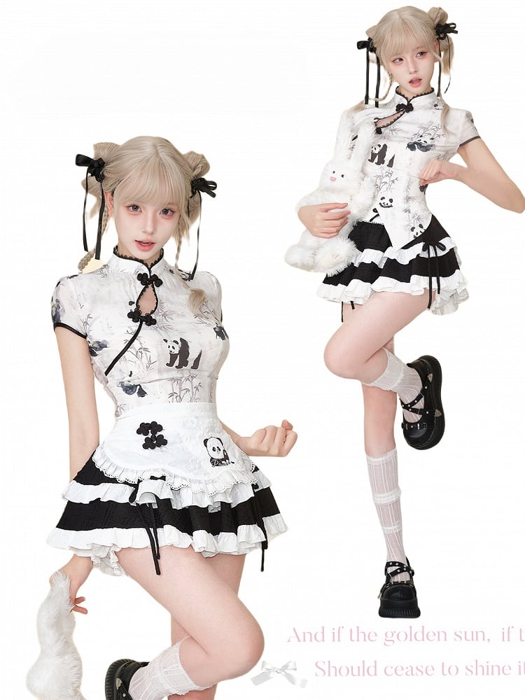 with Top Ink-Style Cheongsam-Inspired Panda Short Sleeve White