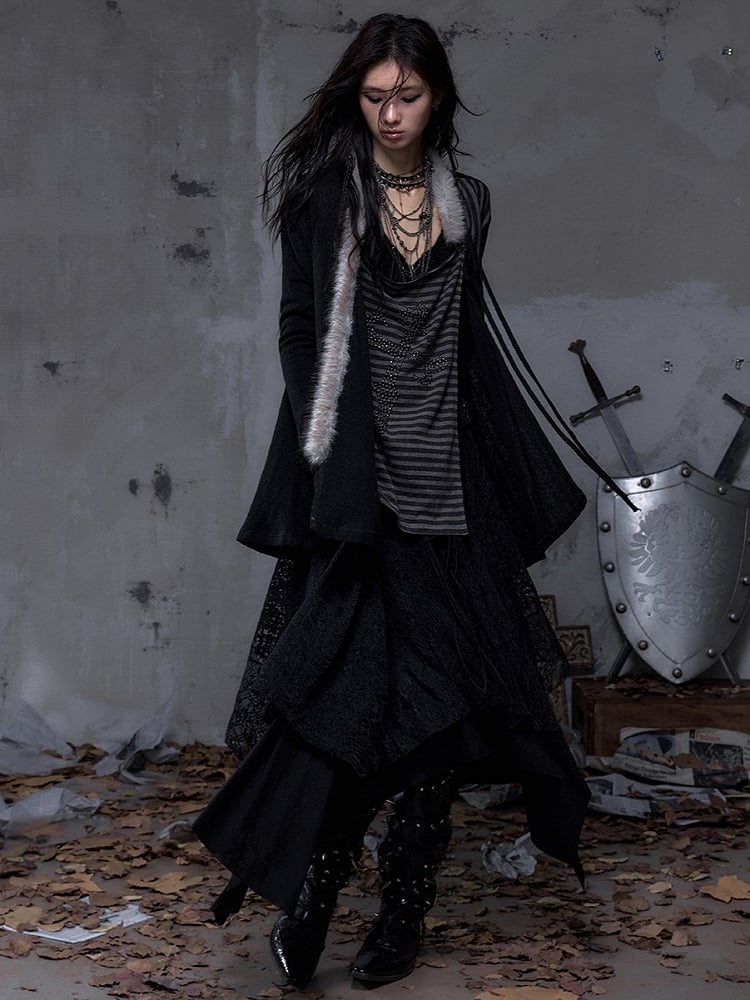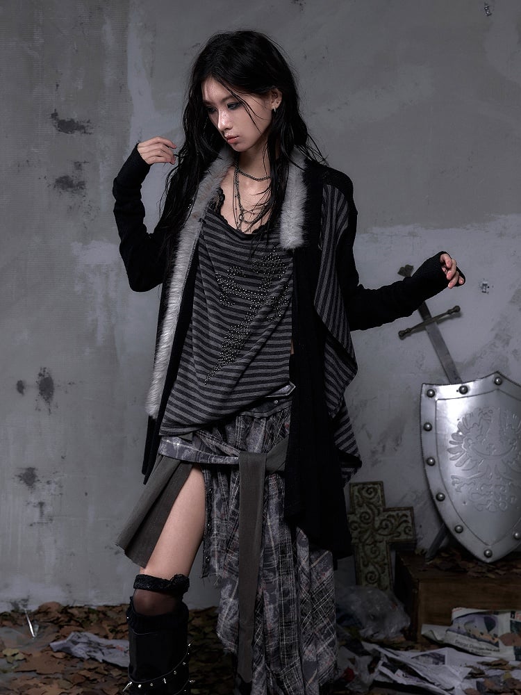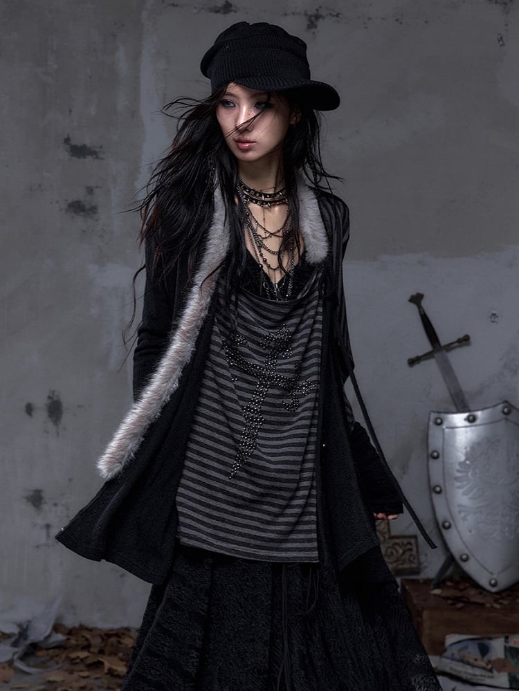 Vintage Punk Faux Two Piece Black Top with Back Cross Applique & Striped Rhinestone Lining