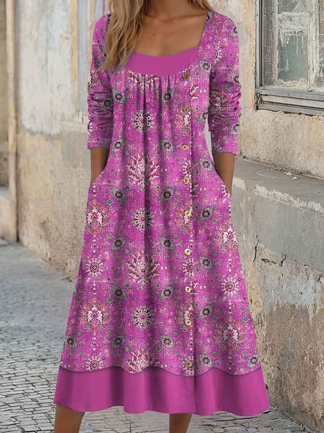 Dresses Type: Shift Dress, A Line Dress, Fabric: Polyester, Gender: Women's, Design: Print, Occasion: Daily, Style: Casual, Fit Type: Regular Fit, Dress Length Type: Midi Dress, Neckline: Square Neck, Sleeve Length: Long Sleeve, Elasticity: Inelastic, Look After Me: Hand wash, Dry clean only, Machine wash, Pattern: Graphic, Geometric, Season: Fall, Winter,