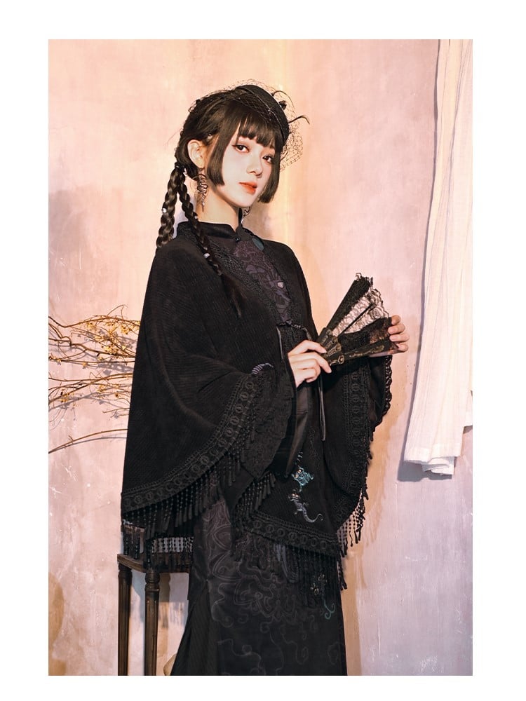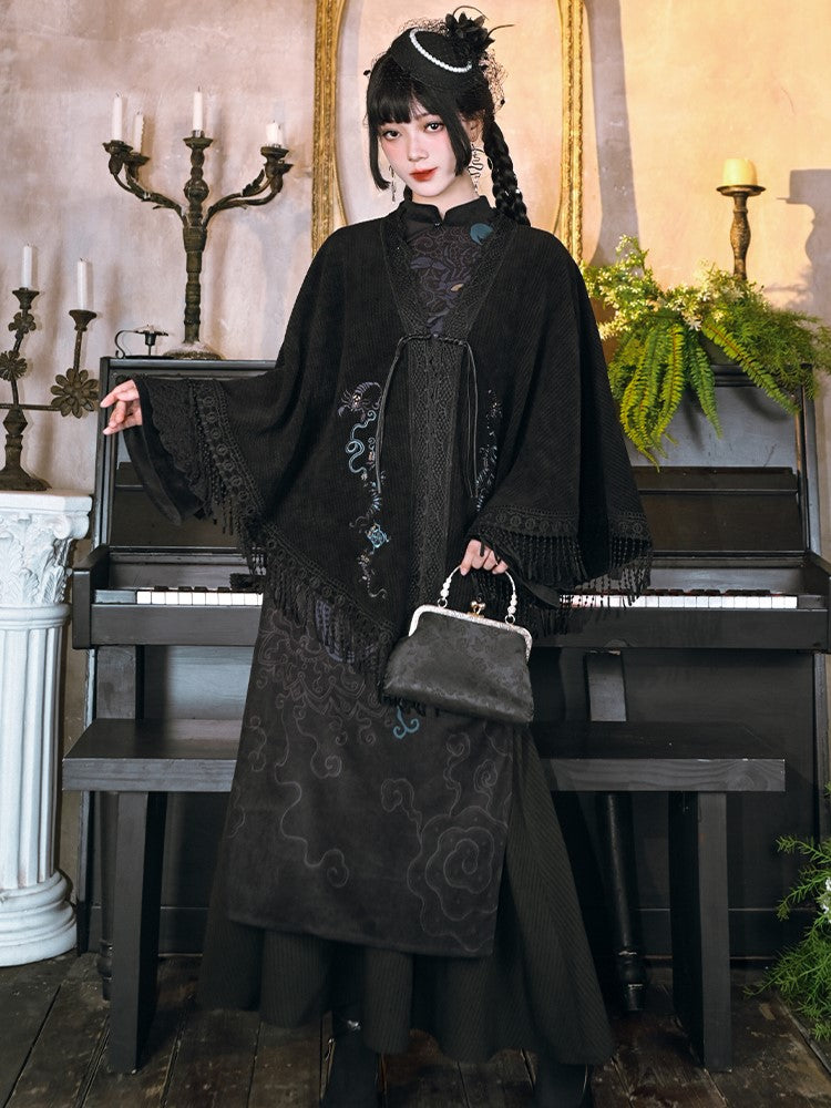 Black Gothic Y-Placket Cape with Five-Poison Embroidery & Fringe Hem