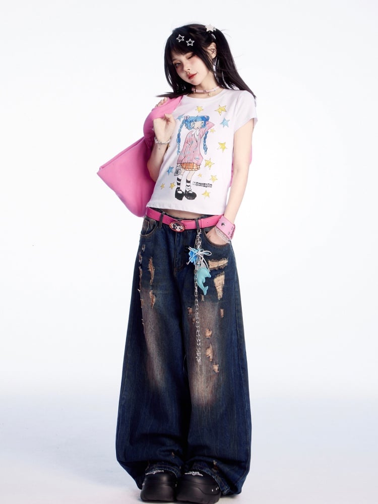 Y2K Cartoon Girl and Star Print White Round Neck T-shirt