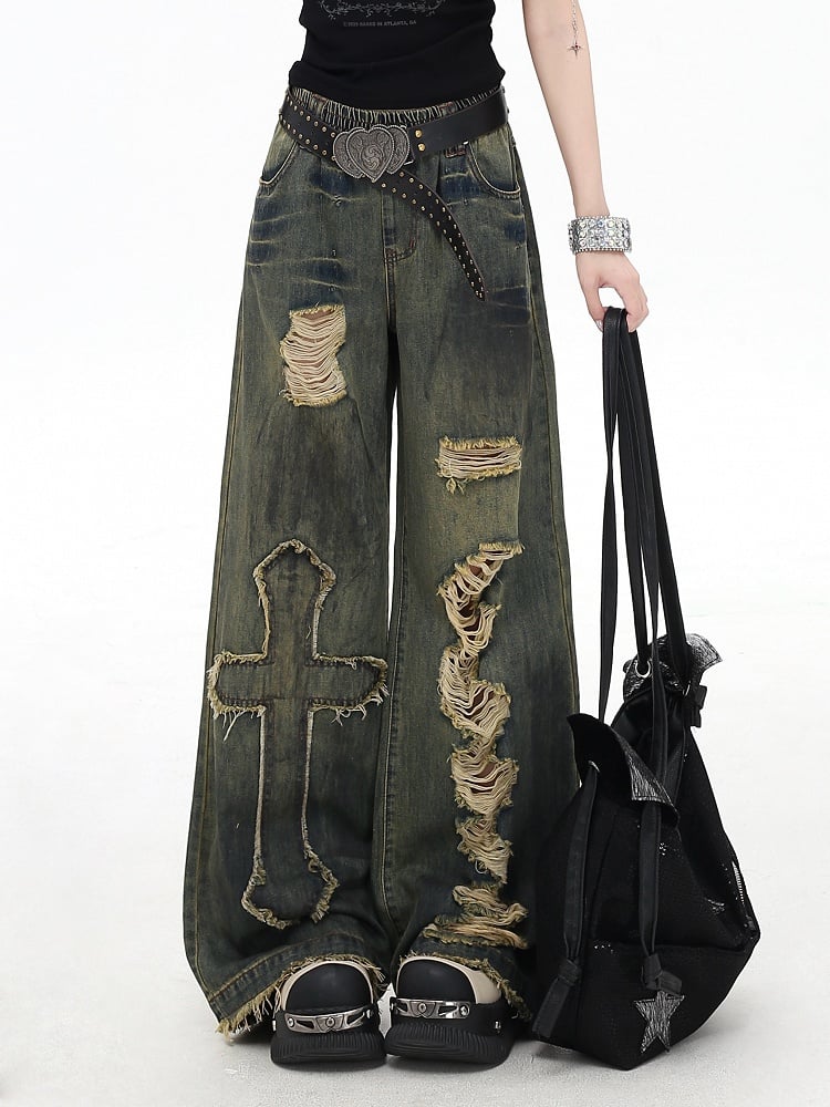 Y2K Cross Applique Blue Distressed Holes Vintage Wide-Leg Jeans