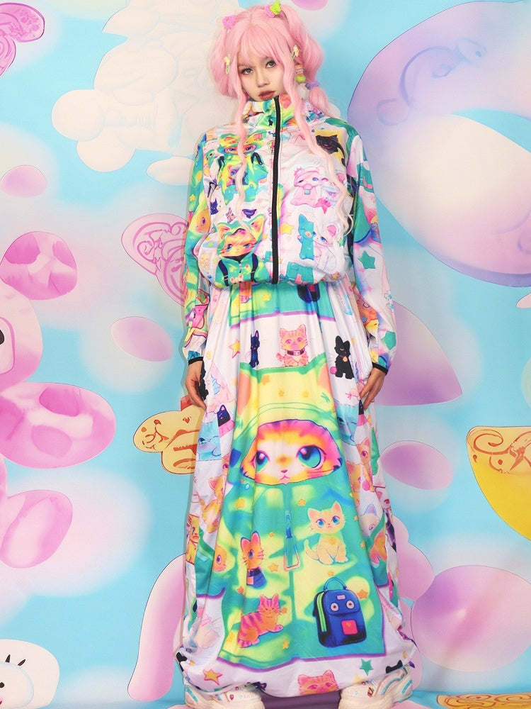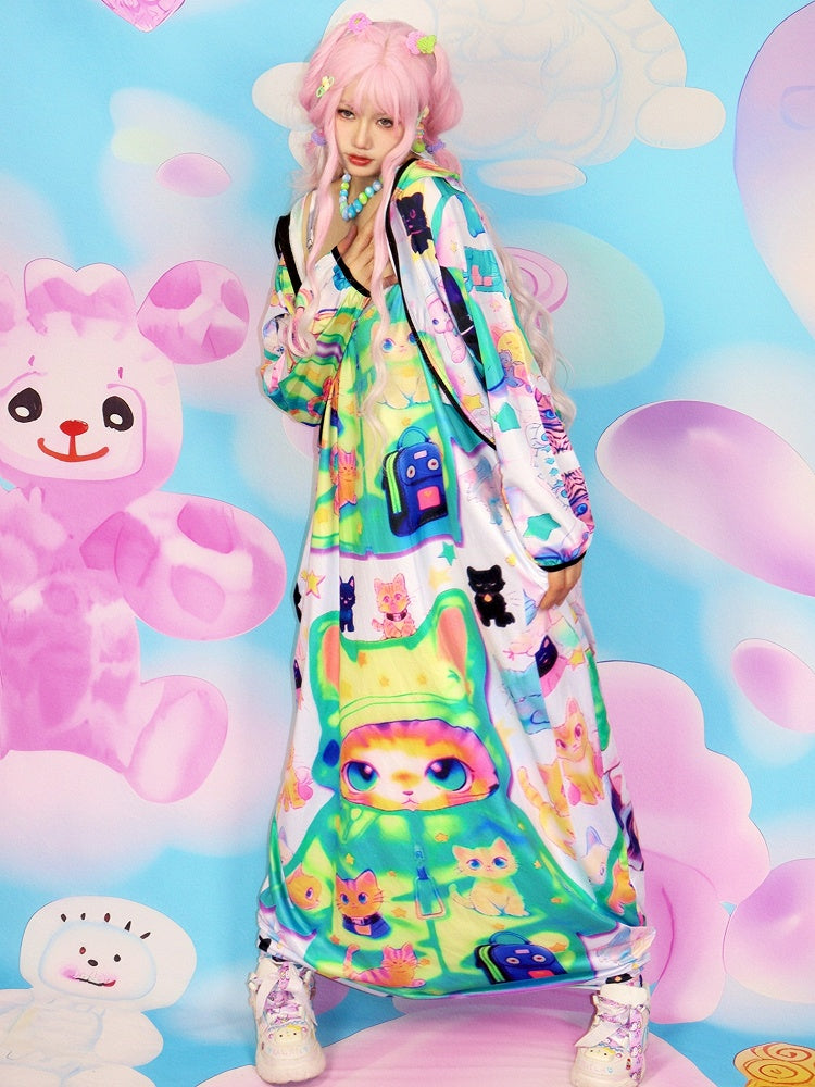 Green Y2K Cat Print Sun Protection Hoodie Jacket
