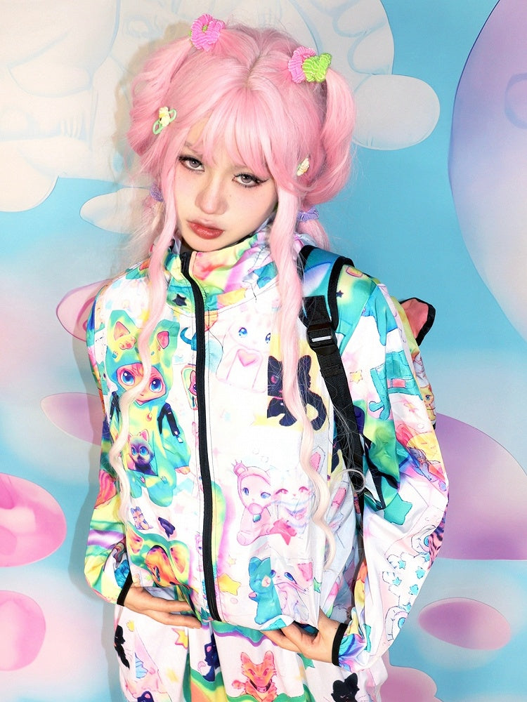 Y2K Hoodie Green Jacket Print Sun Cat Protection