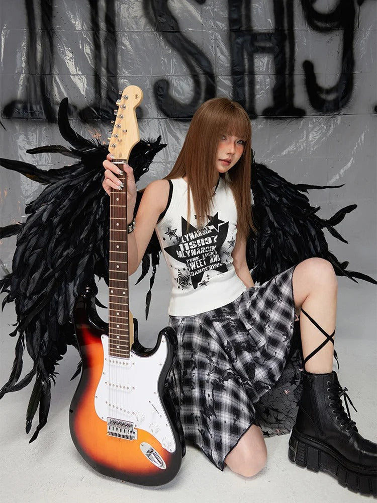 Y2K Black and White Plaid Handkerchief Hem Mesh Glamorous Skirt