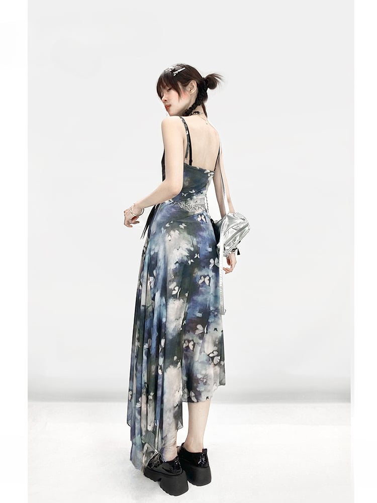 Y2K Vintage Blue Butterfly Print Oil Painting Slim-fitting Slip Dress